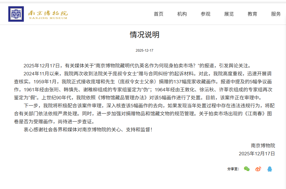 2025年12月17日,有关媒体关于“南京博物院藏明代仇英名作为何现身拍卖市场?”的报道,引发舆论关注。